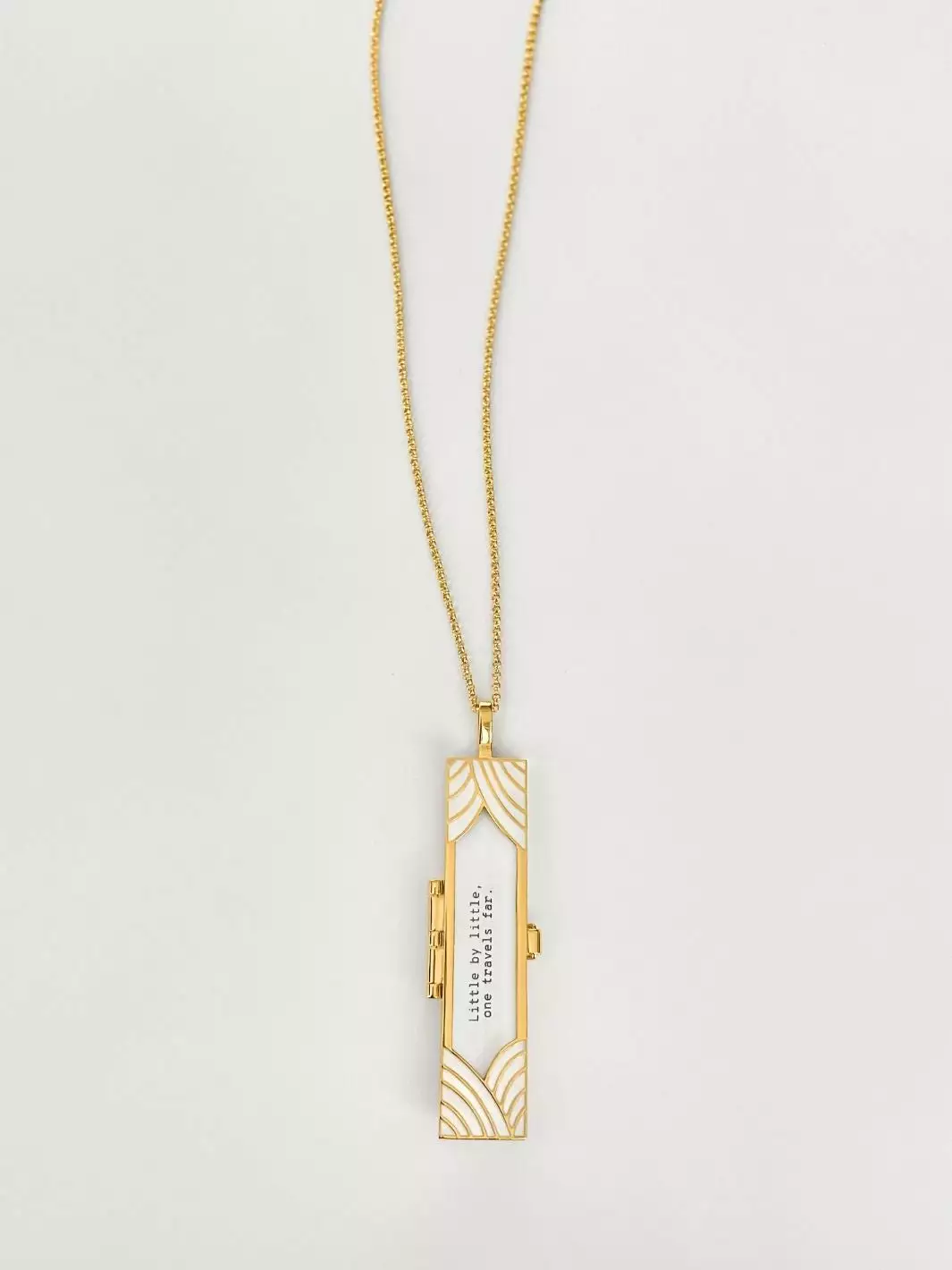 This deco-inspired fortune locket features a dainty pearl enamel detailing and opens to hold your message of the moment.