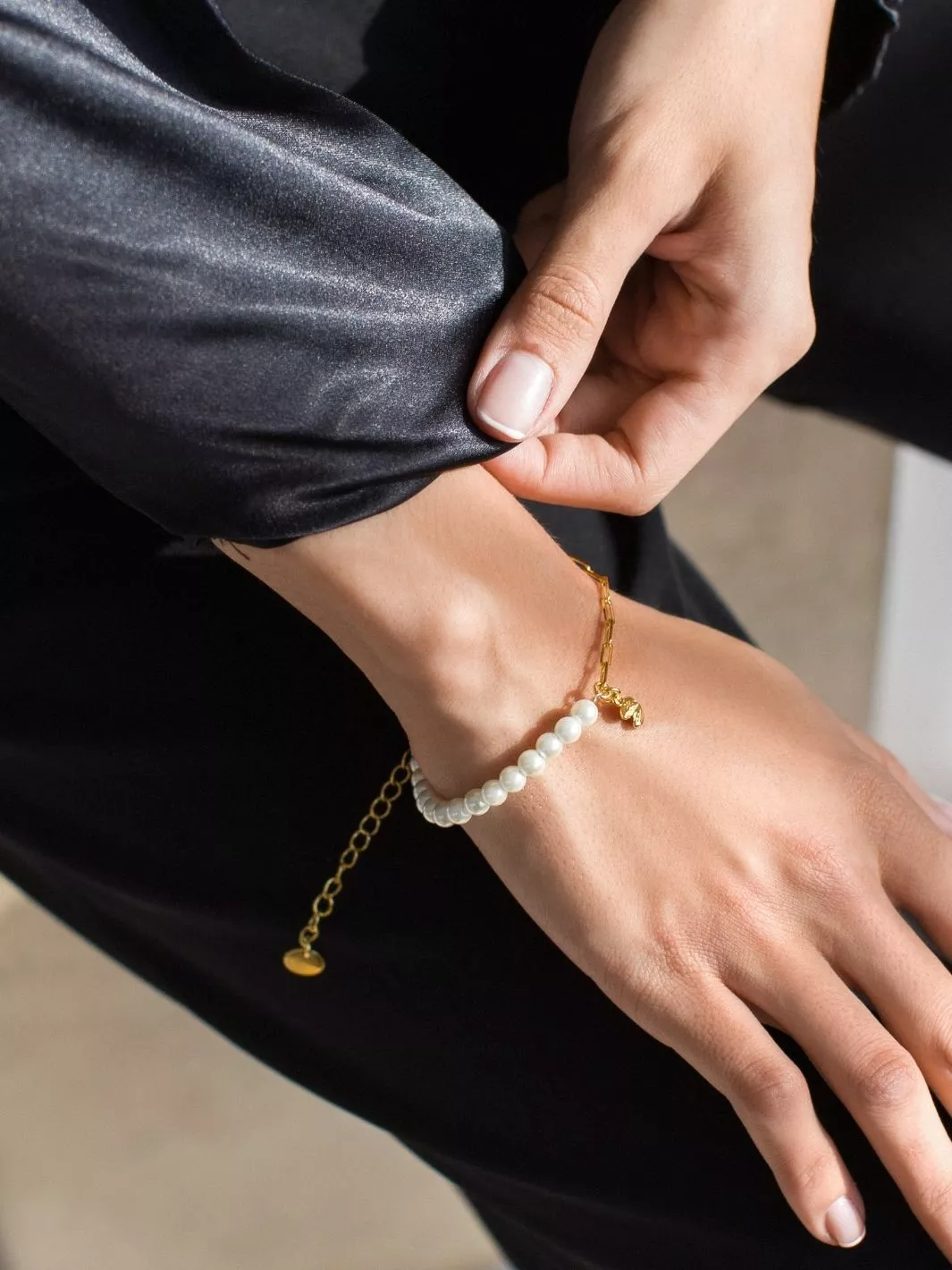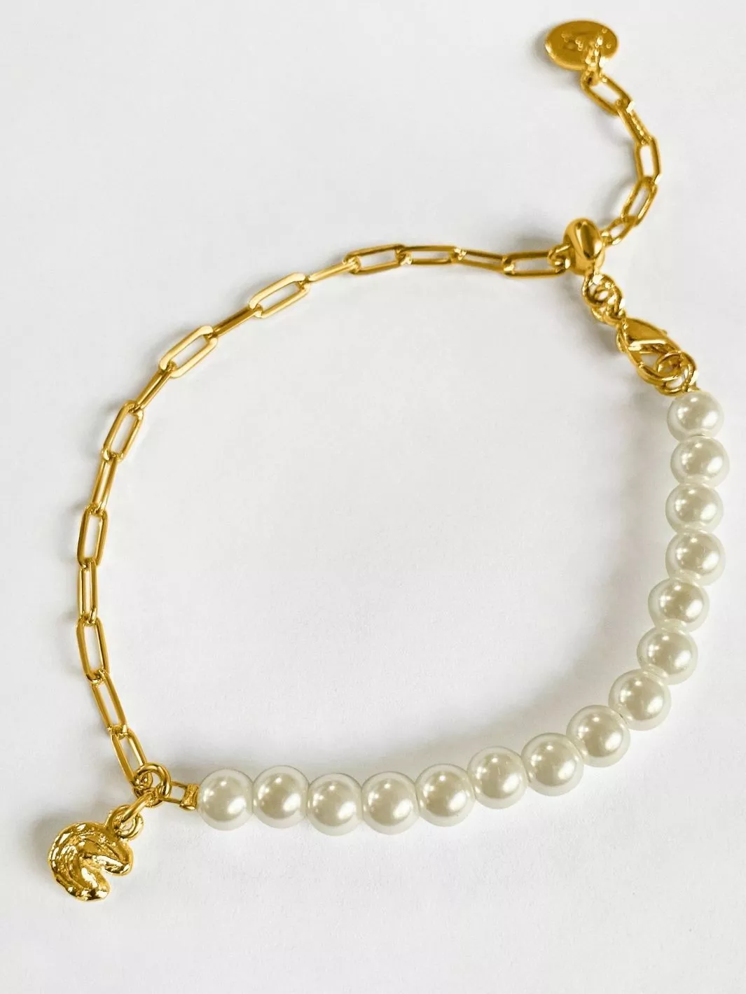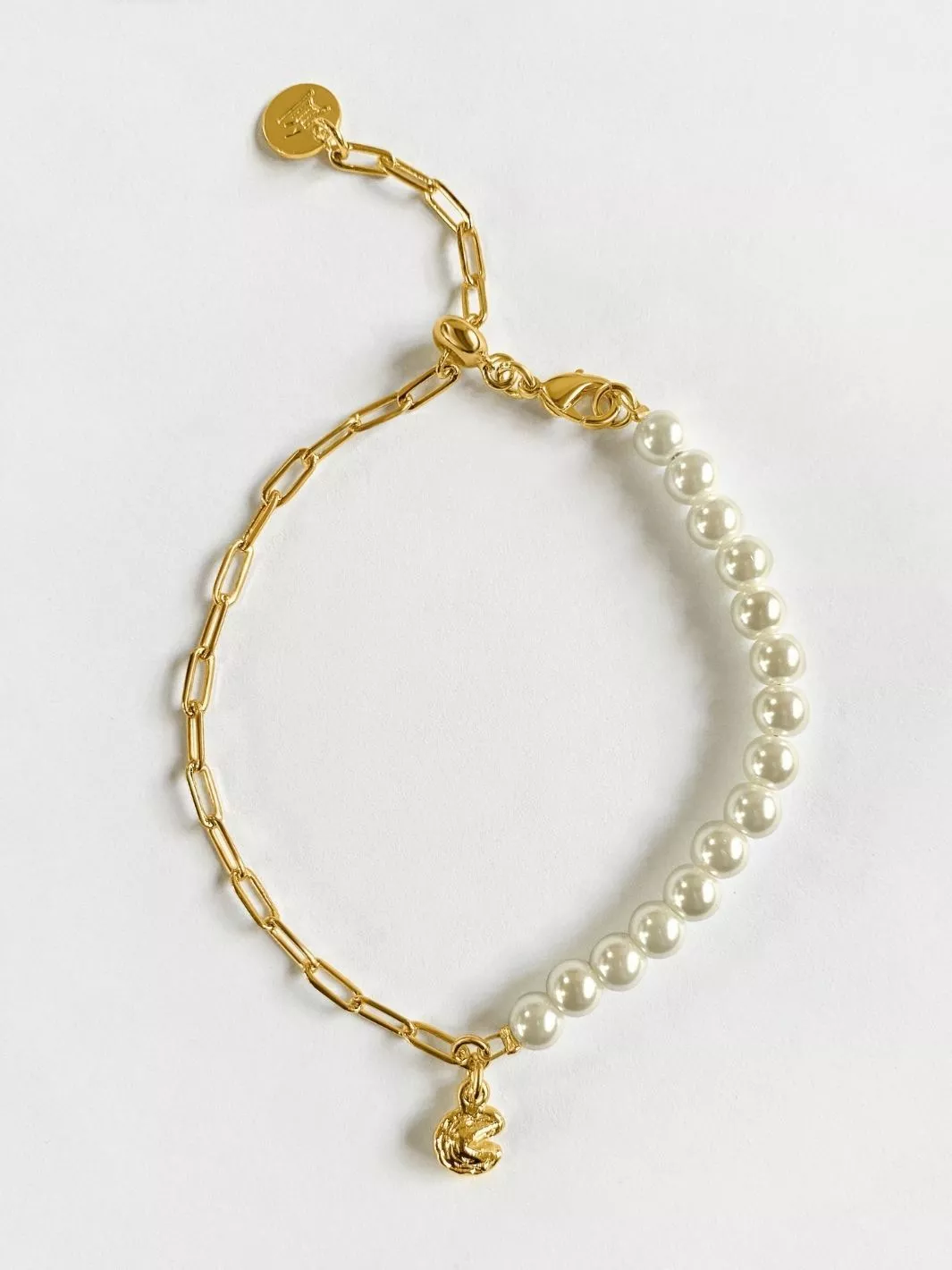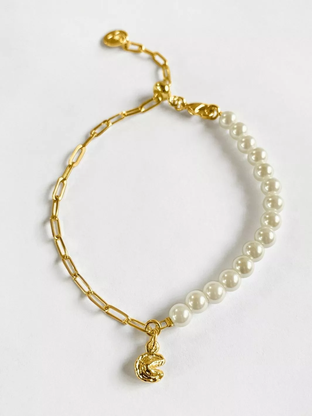Resting on a half paperclip half pearl chain bracelet, this mini fortune cookie charm features a shiny yet rustic texture that closely mimics the real thing.