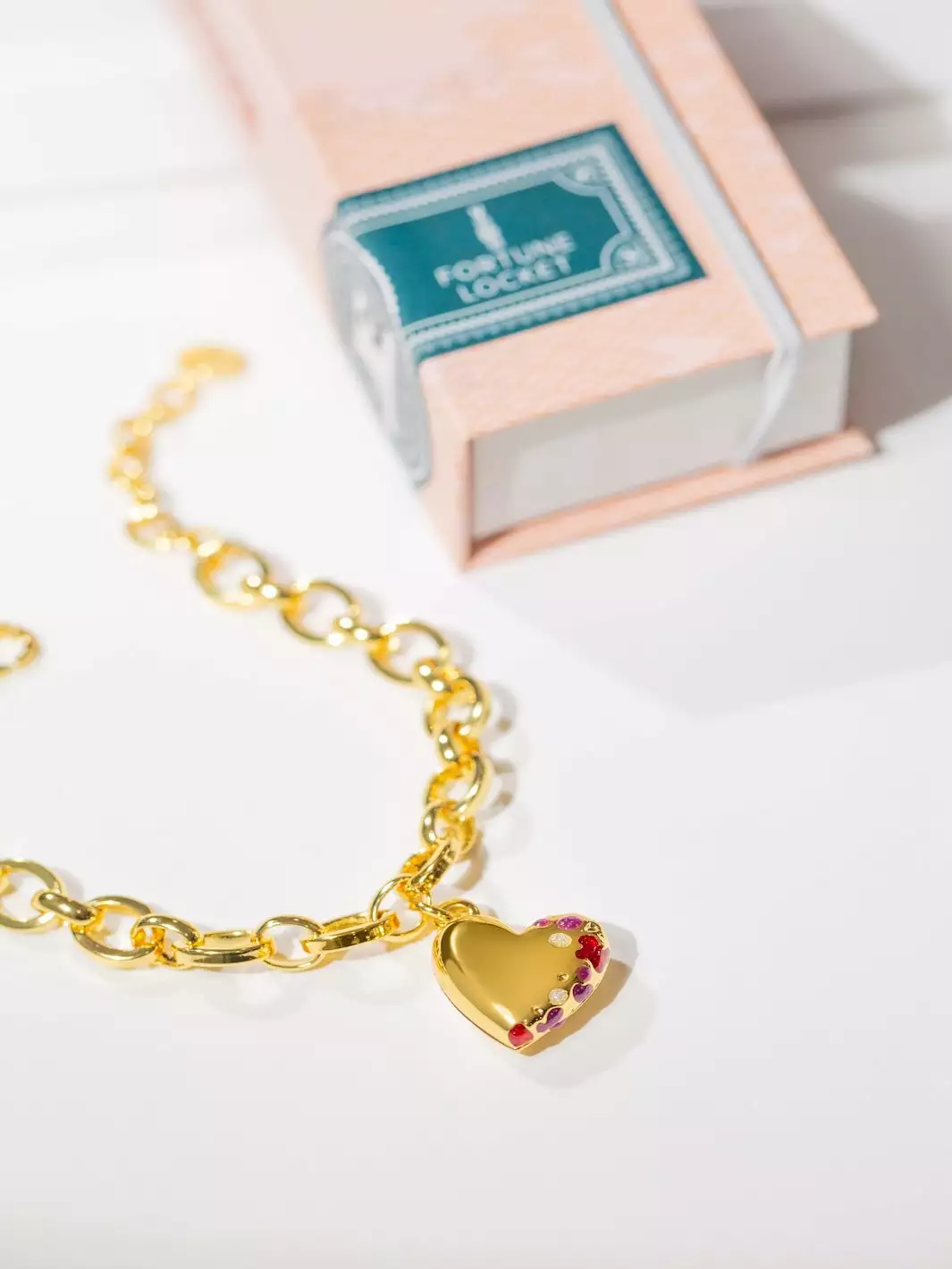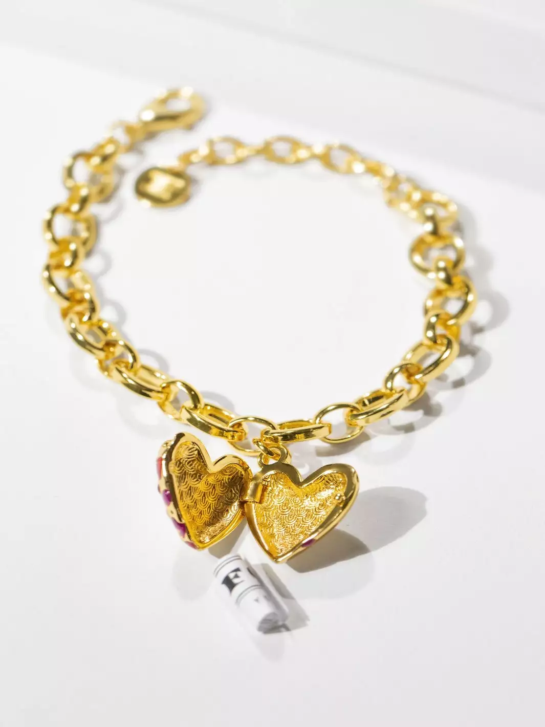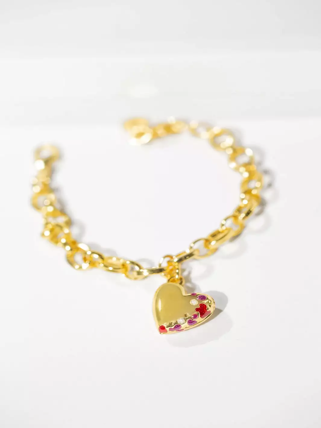 We’ve transformed enamel into Ruby, Amethyst & Crystal-style gems to create this intriguing Heart Locket Bracelet, which sits on a chunky, yet delicate, link chain.