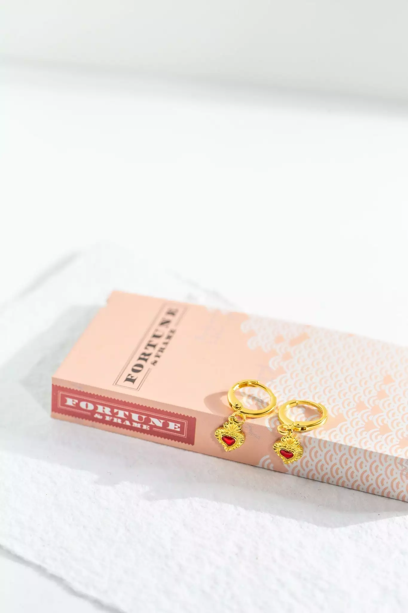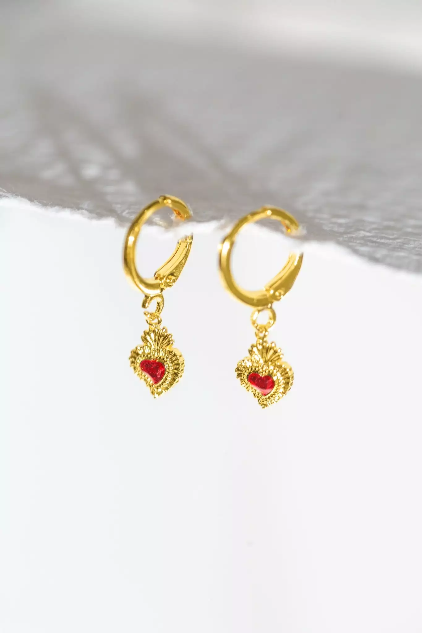 These mini Sacred Heart huggie earrings are embellished with Ruby enamel and dangle from dainty hoops.